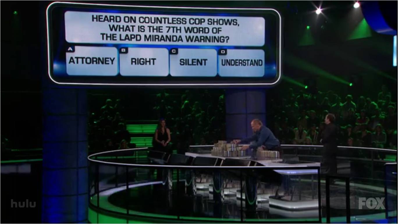 Like the U.K. version, Million Dollar Money Drop will only be a one-week event, probably airing every few months at a time. I like this kind of strategy by FOX network because I believe that this will pull a decent amount of viewers because of its limited availability. This was the similar strategy employed by ABC’s Who Wants To Be a Millionaire, when the show previously aired four nights a week in primetime that made that show as successful as it is today. But, I fear that this show may not reach a staggering amount of viewers because of the show not airing on one of the “Big Three” networks (ABC, NBC, CBS). Million Dollar Money Drop manages to maintain a decent level of suspense, excitement, and challenging gameplay as on the U.K. version. The host, Kevin Pollack, has the similar hosting style of Davina McCall, the host of the U.K. version, in terms of being a “straight-forward” and “to-the-point” host. However, I didn’t like it when Pollack said “How the hell did that get there?” when referring to contestants Brittany and Gabe from the first episode placing $20,000 on a random (incorrect) answer during the first question. There is no reason why the host should be cursing on television, especially when their show is airing during the “family nighttime” slot (8pm-10pm). A game show host should not have to work “blue”, but that’s just me. In addition to that, my only other three problems with the show are the gameplay difficulty and the questions.