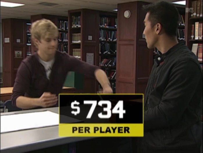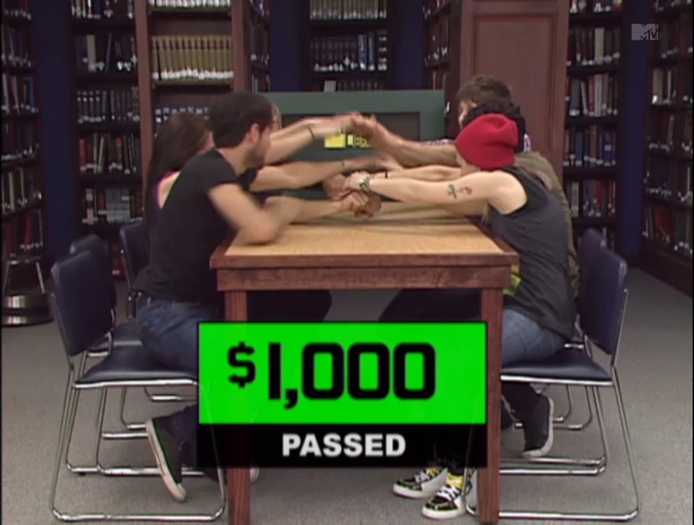 Before I begin my review, I would like to present a few facts about MTV’s Silent Library. Like Hole in the Wall, Silent Library is also based on a Japanese television show. Silent Library is based on a segment on Downtown no Gaki no Tsukai ya Arahende, a popular Japanese variety show. Also, Because of the show’s half-hour length, each episode of Silent Library does not show every challenge that was played in the game. Because of this, it is possible that teams may have won more than their televised final cash total. Silent Library is still enjoyable to watch nonetheless.