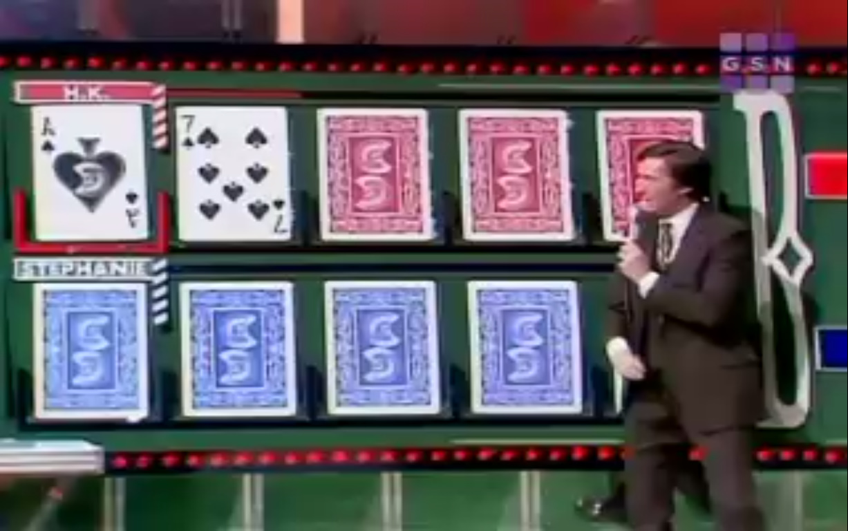 Starting From Scratch: The producers completely scrapped the entire original main game format and had their contestants playing on only one row of seven cards. The contestants couldn’t freeze at any time or even simply change the card with answering a “Clip Chip” question correctly (see picture on left)Four players now played on each episode in a single-elimination tournament style match and the survey toss-up questions were completely removed. Changing the main game format to having two contestants play on only one deck of cards was a horrible idea! This not only dulls the show down tremendously, but it also shows that the producers put little to no effort in the creation of this show. At least in the past Card Sharks shows, the sets were designed with a playing card-based theme. In this Card Sharks revival, the set looks plain and unappealing for a show like this. The best prop they have on the set are the contestants’ podiums designed like Blackjack tables. To add insult to injury, the host no longer had the responsibility to reveal the cards. The hostess pressed a button to reveal the card and flipped the cards herself during the Money Cards Bonus Round. Once again, signs of laziness by the producers and the host.