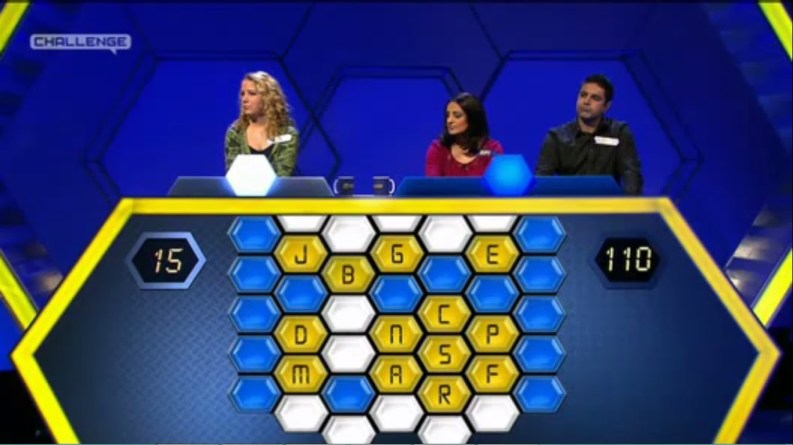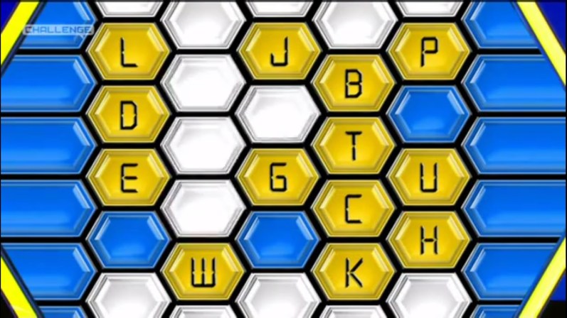 Premise- One contestant competes against a team of two contestants. The contestants play on a 5×4 hexagon board, with each hexagon containing a letter. Every question is a toss-up question and a contestant can buzz-in in the middle of the question being asked if they know what it is. If a contestant answers a question correctly, the hexagon will turn to the corresponding color of the contestant/team and they will get to choose another hexagon. The contestant/team will also be awarded £5 for every correct answer. The solo contestant (represented by white hexagons) has to make a vertical connection with a minimum of four correct answers. The two-player team (represented by blue hexagons) has to make a horizontal connection with a minimum of five correct answers. The first team to win two games will win the match and plays the Gold Run bonus game.