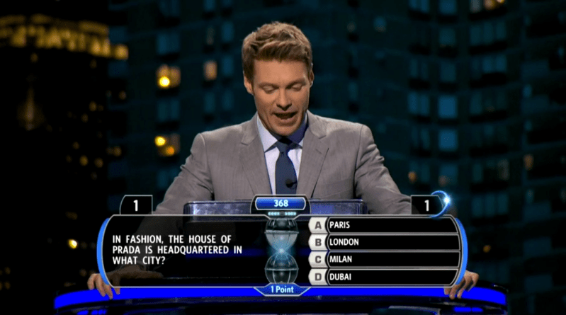 Ryan Seacrest is the optimal choice as host of The Million Second Quiz with his experience as a game show host and hosting live television programming such as American Idol and Dick Clark’s New Year’s Rocking Eve. His enthusiasm, social and amiable presence when speaking to the contestants, making appropriate, relevant comments while the contestants are locking in their answers during bouts and asking the questions in an undistracted and hasty fashion makes the show more enjoyable and exciting to watch. Seacrest’s minute-long interviews with the contestants reminded me of how Bill Cullen and Dick Clark would conduct their contestant interviews to make them feel less nervous and more comfortable before proceeding with the game.