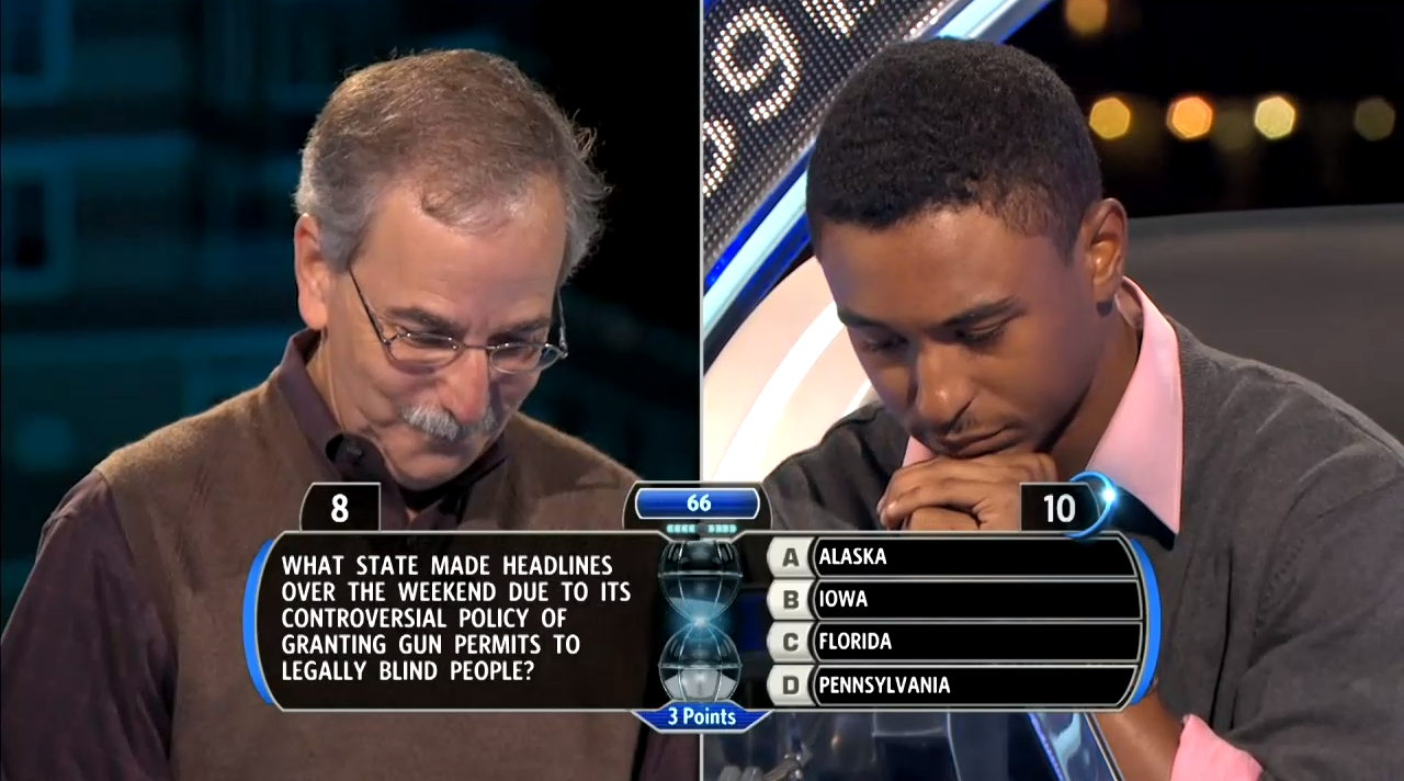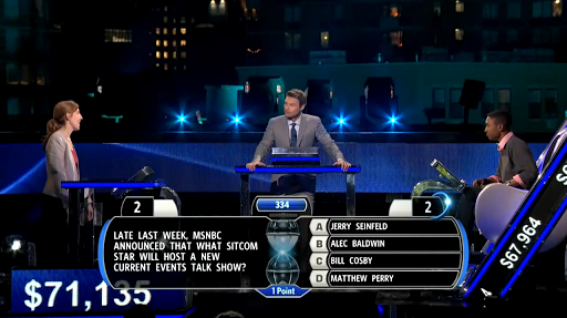 Fake Suspense: On the final question of the night after Brandon locked in his answer, the show attempted to build pointless suspense by removing two incorrect answers, leaving only the correct and incorrect answers. If this method had been used throughout the show, then I would be more open-minded to the idea. Otherwise, it’s not need. The game itself is suspenseful enough without making corny and futile attempts to add useless, dramatic elements.