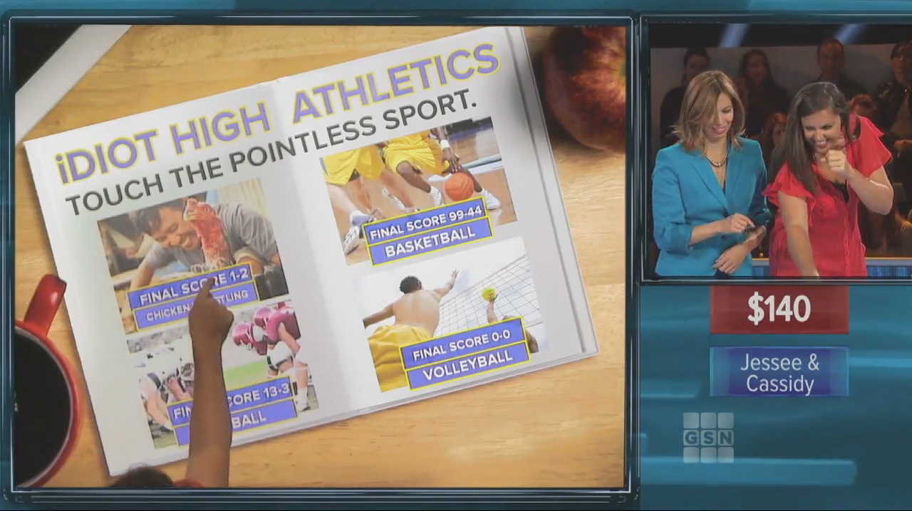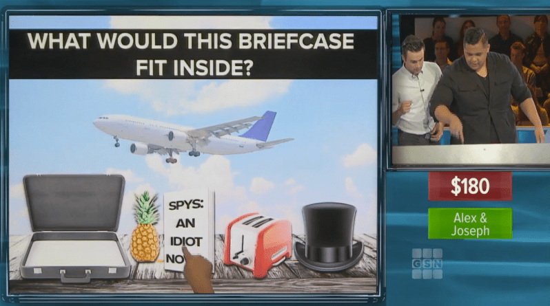 Idiotest is one of the more creative and devilishly clever game shows to come from GSN. This simple, riddle-driven game show has the same appeal that ABC’s Million Dollar Mind Game had, albeit its a water-downed version of it given the difficulty of the mind-boggling questions. I also see a this show resembling Now You See It, in terms of the similar premise of “the answers are always in front of you”. The questions are excellently written and actually require some thought, even though some are seemingly easy at first glance. For instance, “What’s something you can put in a barrel that will actually make the barrel lighter?” (Click here for the answer.) Much kudos to the writers. Although the brain teasers are seemingly simple when you get a good look at them, the insertion of the money countdown clock puts the contestants in a slight frantic state, making them unable to think clearly and forcing them to answer quickly and prematurely, as you may have seen within the first two episodes. The money clock increasing the questions’ difficulty is similar to the confining area of The Cube, on the ITV game show of the same name, making some of the physical challenges appear a little more difficult.