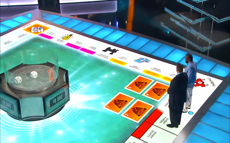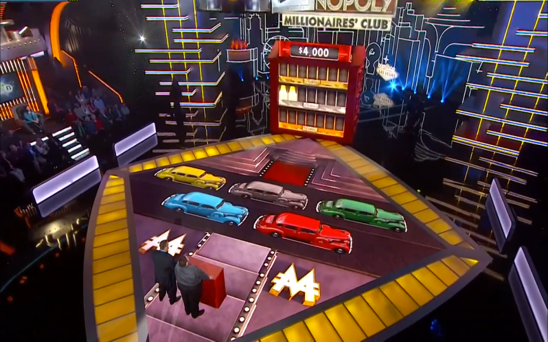 Amazing Set: What do game shows like Press Your Luck, The Price Is Right and The Cube have in common? They all are game shows whose intriguing, interactive sets “come to life” whenever the game is played (e.g.: on Press Your Luck’s Big Board, The Price Is Right’s Pl!nko board, The Cube itself) and keeps the home audience engaged to gameplay (and even makes them want to audition and compete on the show in person to experience it for themselves. (I dare you to find one person who doesn’t want to spin The Price Is Right‘s big wheel or traverse through Legends of The Hidden Temple’s temple (sans the temple guards) at least once.) Monopoly Millionaires’ Club has, hands down, the most creatively designed, incredible and vibrant sets I’ve ever seen on any lottery game show, U.S. or abroad.
